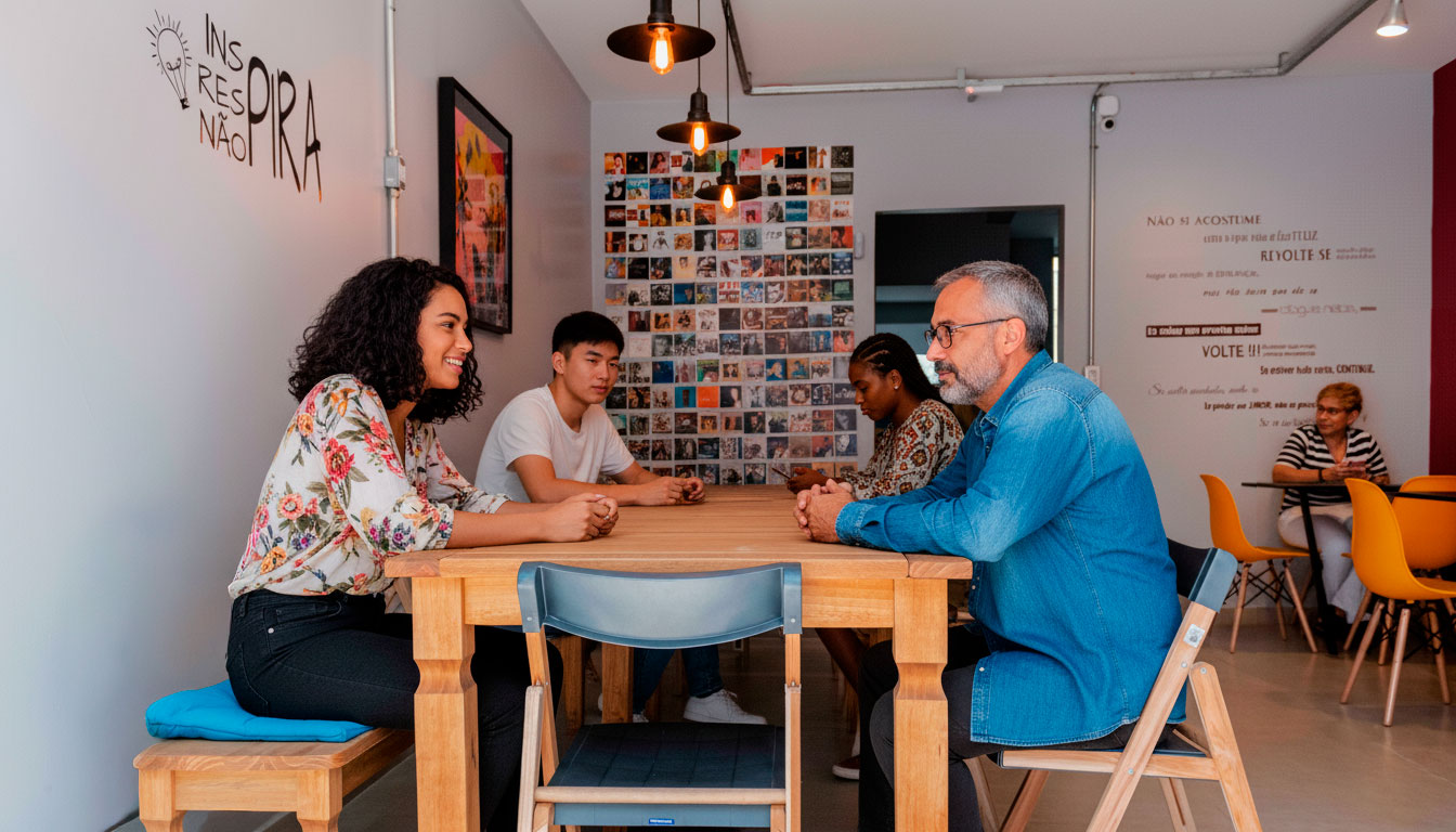 descanso, refeições e conexões, ao vivo ou